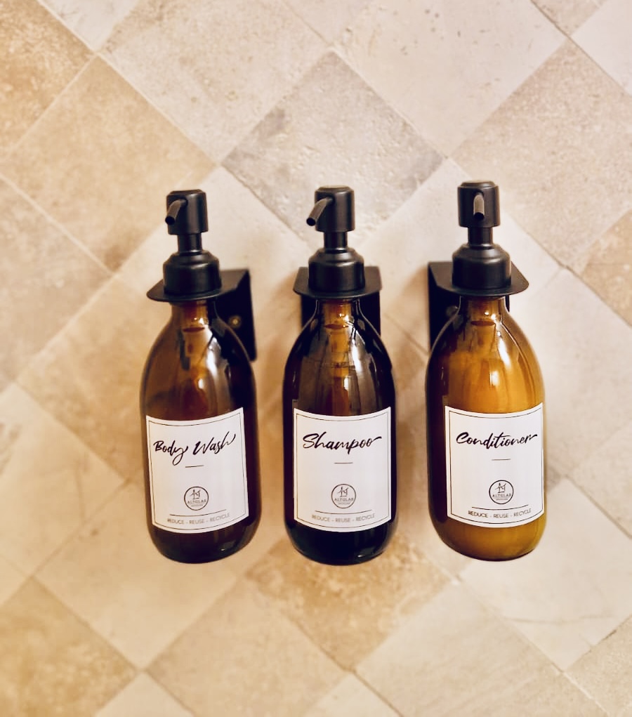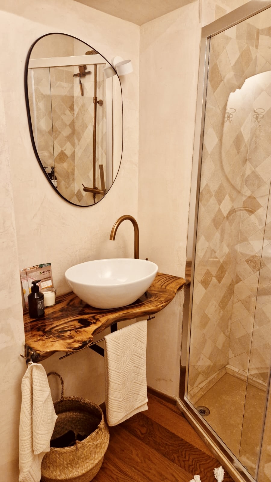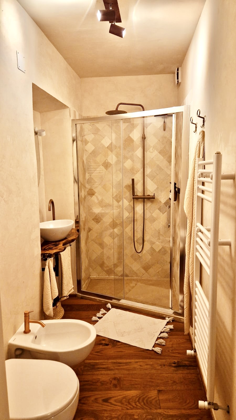 Shower, tiled in travertineRain showerShampoo, conditioner, soap, shower gel, bidet-soapToothbrush setWCBidet6 fresh fluffy towels in 3 sizes